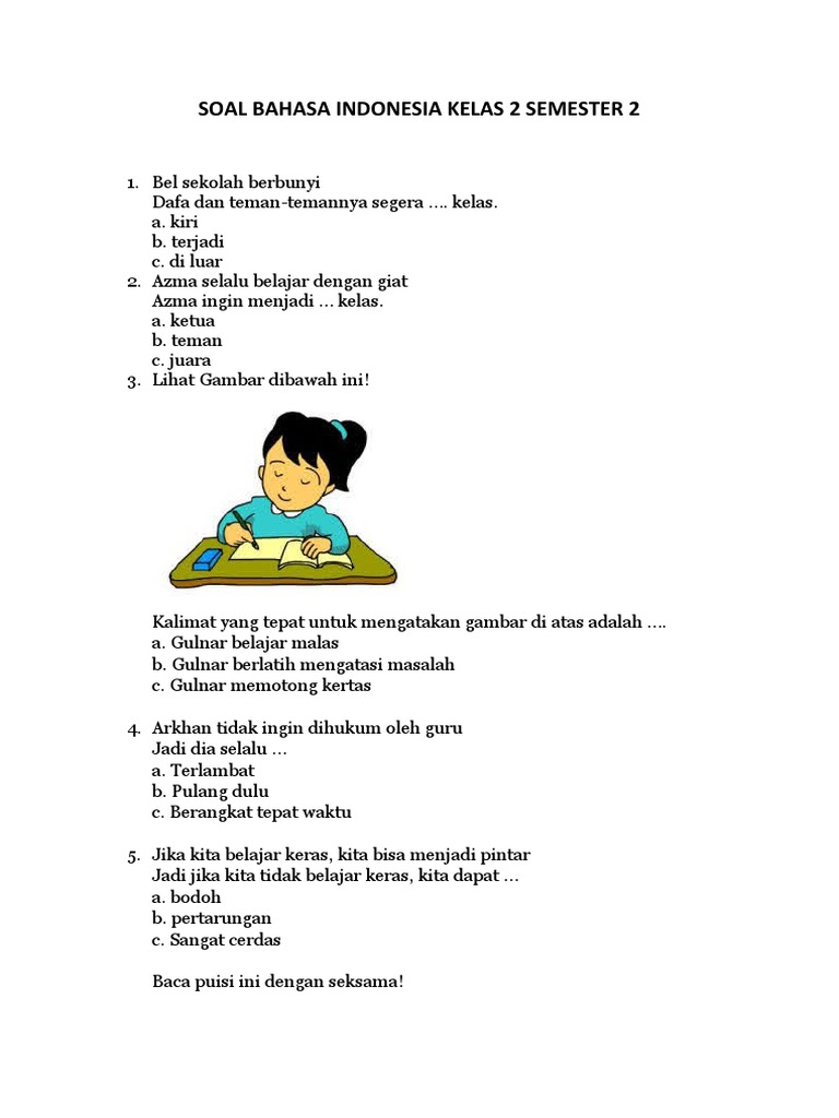 Untuk menguatkan pemahaman siswa kelas 2 SD tentang kebersamaan, guru dapat merancang berbagai bentuk soal Bahasa Indonesia yang relevan. Soal-soal ini tidak hanya menguji kemampuan membaca, menulis, dan memahami teks, tetapi juga secara implisit menanamkan nilai-nilai positif yang terkandung dalam kebersamaan. Artikel ini akan membahas berbagai contoh soal Bahasa Indonesia kelas 2 SD yang berfokus pada tema kebersamaan, beserta penjelasannya, untuk membantu para pendidik dan orang tua dalam membimbing anak-anak.